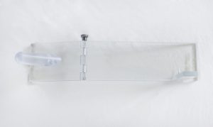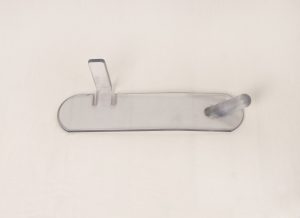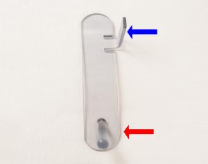 • At the distal edge (red arrow) of the brace, an additional piece of Lexan plastic at a 45 degree angle allows the patient to securely hold their hand in place during the procedure.
